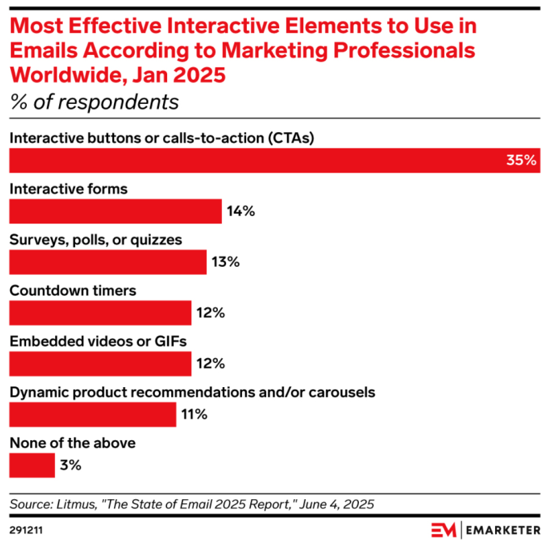 Interactive buttons or calls-to-action (CTAs) are the most effective interactive elements to use in emails according to 35% of marketing professionals worldwide, per January 2025 data from Litmus.