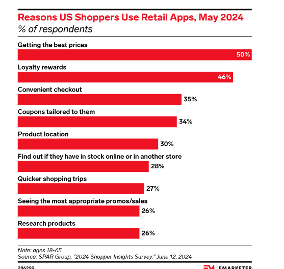 Data InsightsGetting the best prices motivates US shoppers to use retail apps24 de julio de 2024Sin Comentarios1 minuto leer408 views 50% of US shoppers use retail apps to get the best prices, according to a May 2024 SPAR Group report.