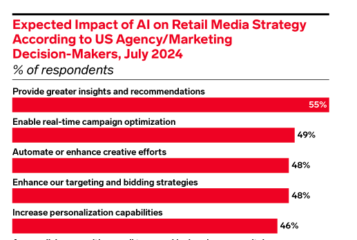 55% of US agency and marketing decision-makers expect AI to improve retail media by offering greater insights and recommendations, according to a July 2024 study from Quartile and NewtonX.